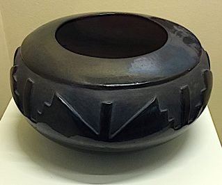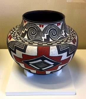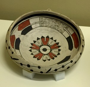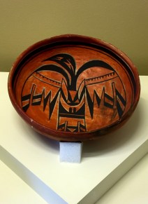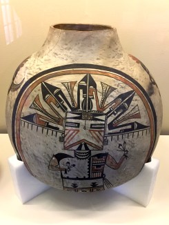 After reading this history I peered through glass panels of doors into curator labs and caged storage shelves. A bit of office detritus littered the rooms with the feel of a hasty evacuation of all artifacts and their accompanying scholarship. But the Pueblo pottery exhibit was a room full of treasured artifacts that made the museum well worth the visit. It was a rich collection of old pottery, as well as contemporary, with descriptions of the different styles from various Pueblos. I took my time to read it all as I viewed the simple or elaborate designs and colors. Mono tones, two tones, and multicolored bowls and canteens of utility, as well as figurines and highly decorative designs intended only for display. Stories of the skilled artisans behind the works were plentiful when they could be identified.   The pottery was mostly made by women, but sometimes painted by men. Male potters were sometimes “two-spirit” people. Men who dressed and took on the traditional roles of women. With the arrival and use of metal and modern utensils the skill slowly declined for a while before anthropologists and traders began to promote the craft again amongst the Pueblos. Mainly for tourist’s consumption the little figurines and small pieces the tourists could take home with them, became the bulk of the potter’s output. Little rain gods, a tourist trade derived invention, packed barrels at Santa Fe trader’s shops at the turn of the 20th century. As the craft evolved and changed, the artisans gained recognition. Nampeyo, Tonita and Juan Cruz Roybal, Maria and Julian Martinez, Susana Aguilar, the artist’s names and their stories gave a fuller human dimension to the artifacts. To me it was all a nice change from the ostentatious luxury arts of the Golden Kingdoms I’d viewed the night before. But this was still exquisite art made by people of modest means. The pottery was ornamented with birds of prey and other fowl, serpents, Kachina figures, and various abstract patterns in the Southwest Indian style. Despite the false reports of a Coronado expedition padre, the Pueblos were not the fabled, gold-laden, Seven Cities of Cibola. The bowls were crafted from humble clay, and plant and mineral derived tints; all of it decidedly friendlier on my eyes than flashy gold and silver loot from fabled cities.