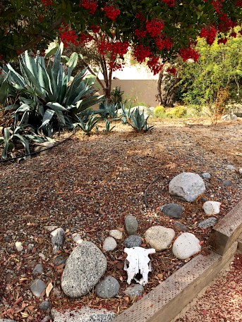 Despite the precarious future of the museum the exhibit put me in an easy state of mind. Admittedly this wasn’t the turn away history. I walked around the grounds of the museum situated on the hillside, as it is. Indigenous themed wrought iron sculptures dotted the courtyard. Contemporary renditions of Kachina-like figures danced against a wall. A tomol manned by four paddlers strove against a current of grey oval stones. A real wooden totem pole with an upside-down figure sporting an oversized phallus supported a colorfully masked face, a bear, and a seahawk’s head with its fiercely downturned beak. The grounds were a bit unkempt in that quaint decay I often enjoy encountering on my travels. Well groomed places don’t reflect as well a more intriguing history as do places with a hint of melancholy. I think it’s part of the reason people like ancient ruins. California fan palms floated around the red tiled roof; agave and toyon grew among the palm trunks.   A ubiquitous bleached and decayed cattle skull with broken horns lay beneath the deep red ‘hollywood’ berries of a toyon. There were concrete steps that led down to a light rail station along the Arroyo Seco Parkway. But they were busted up a short way down the incline with yellow caution tape barring the way. Some gardening utensils and a water hose were haphazardly strewn across the neglected gardens.